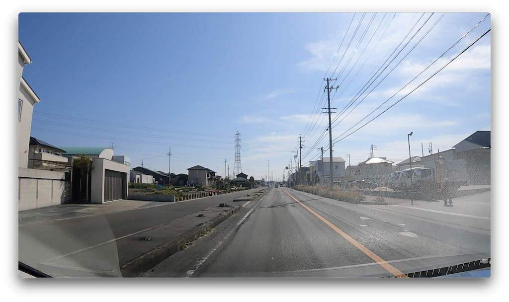 この県道の半分以上にこのような不自然に大きい歩道があります。これはこの道がその昔、電車が走っていた線路だったからとの事です。そのせいか、車の道路が歩道よりも気持ち高くなっている箇所が多いです。