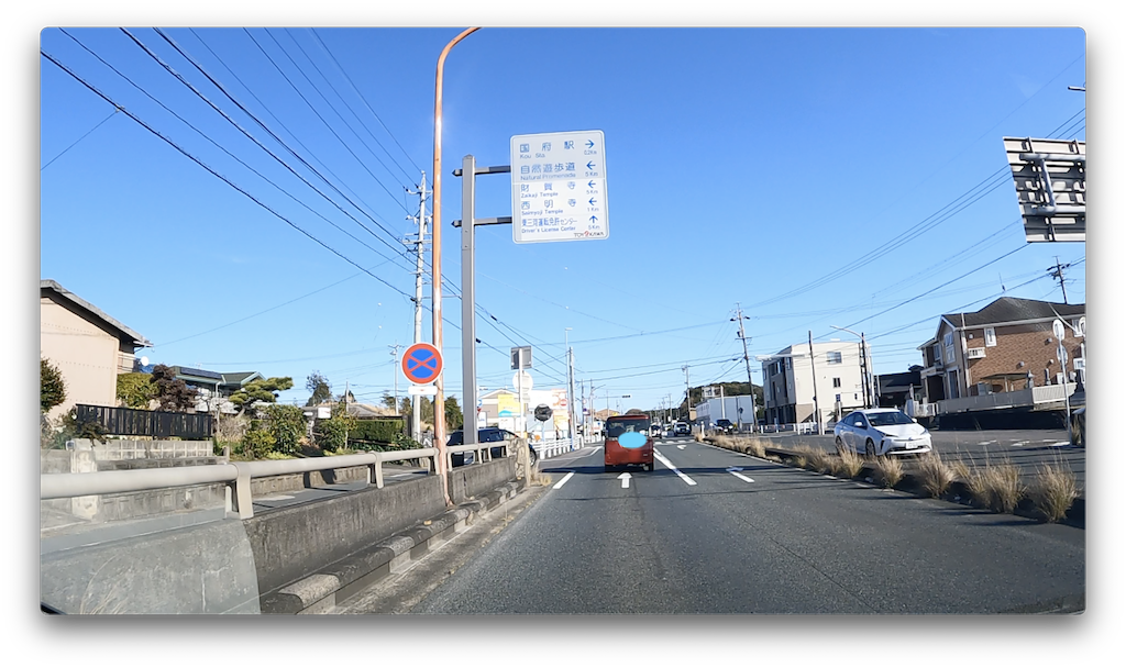 高架橋を超えた先のこちらを右に進むと国府(こう)駅に行けます。国府(こう)って所見だと読み方難しいですよね。今回は真っ直ぐ進みます。