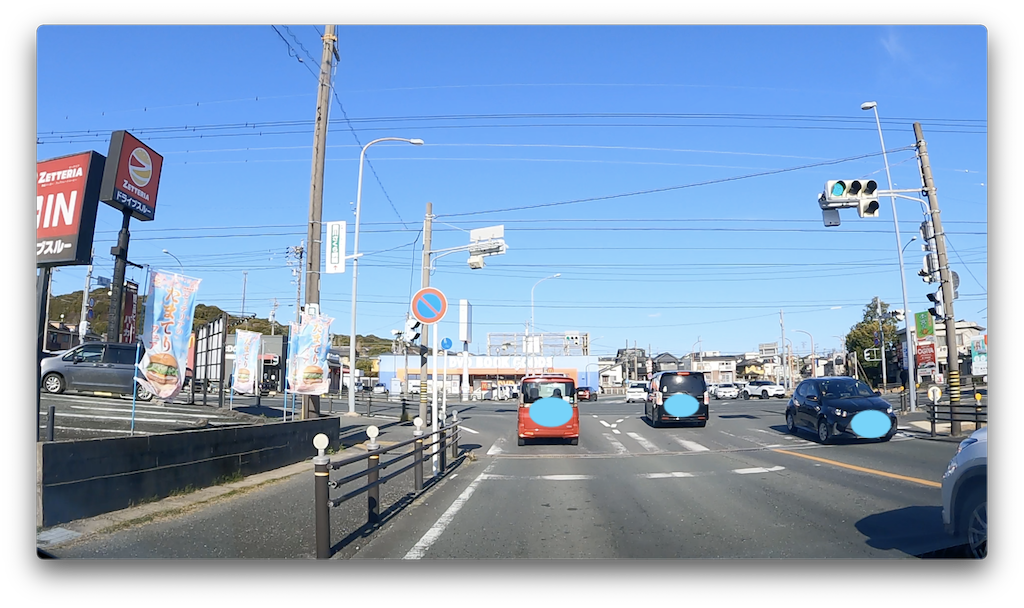 その先にありますこちらの交差点から片側1車線になります。車線が右折専用と左折専用と直進の3つになるので注意して直進車線を進みます。