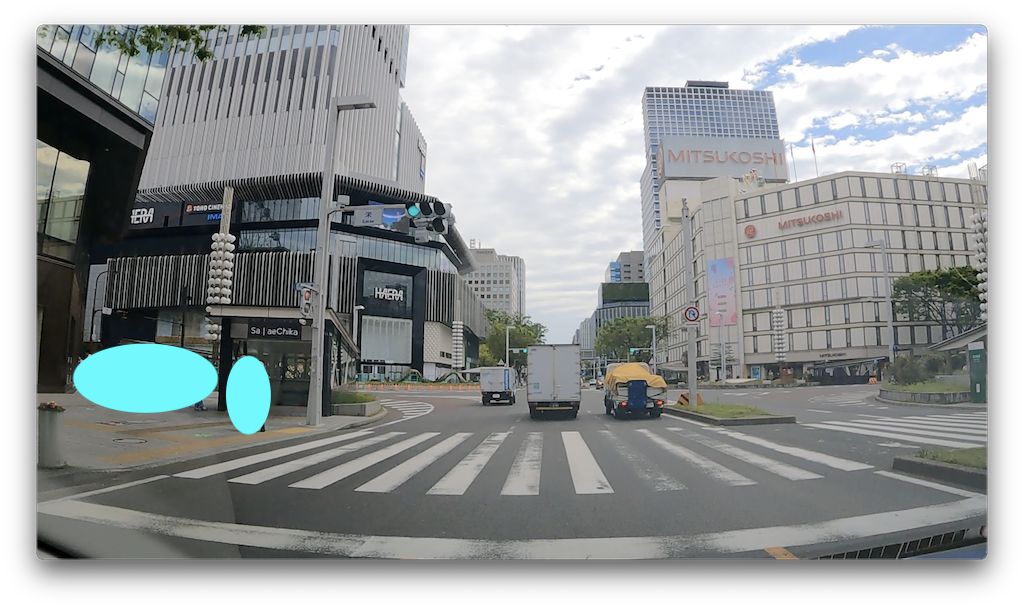 その先のこちらの地点が、名古屋の中心繁華街、栄交差点になります。百貨店やデパートが目立ちますね。地下には栄駅の地下街も広がっております。交差する通りは大津通、右折で名古屋の名スポット大須商店街エリアへ、左折で名古屋城へ行けます。